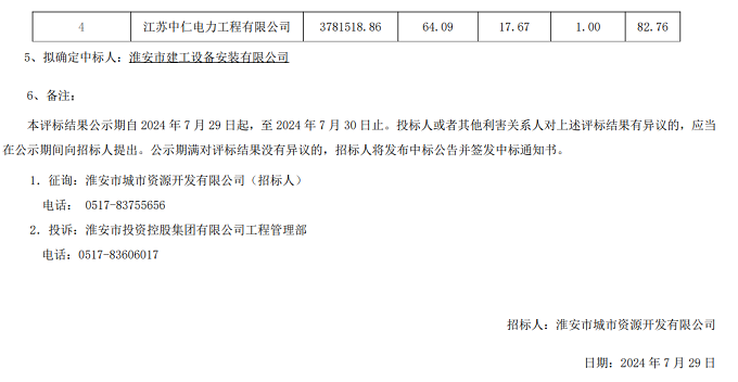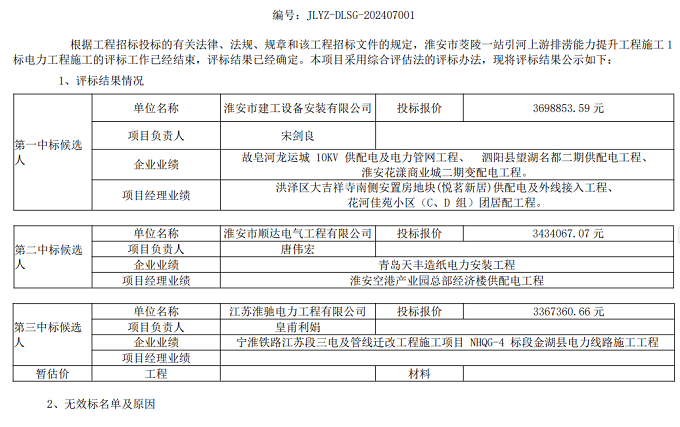 淮安市茭陵一站引河上游排澇能力提升工程施工1標電力工程施工中標候選人公示